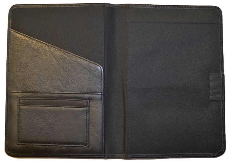 8 1/8" x 5 3/4" x 7/8" top-grain leather cover with matching fabric lining. Multiple inside pockets. Elastic pen loop (no pen included). Refills available for $7.95.