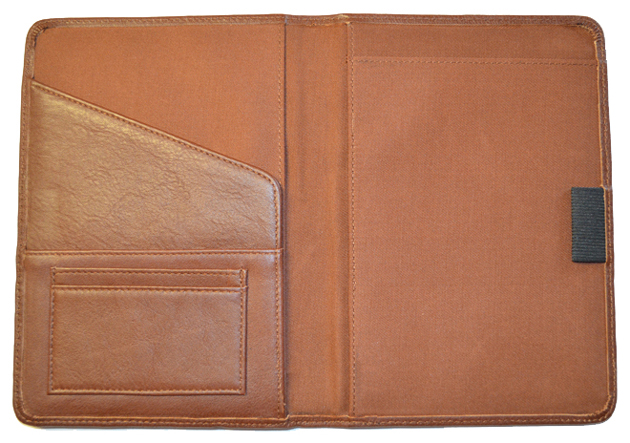 Our 6 5/8" x 4 1/8" x 1/2" pocket planner has a choice of inserts—a calendar, journal or address book—with refills available for $7.95 each. The left side has three business-card pockets and a document flap; the right side has top-loading and side-loading slots, plus a pen loop (pen not included).