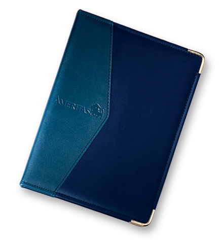 9" x 6" Cover. Durable soft-touch imitation leather. Sewn, padded covers Rounded metal corners. 8" x 5" tabbed address book. 8" x 5" weekly/monthly calendar.