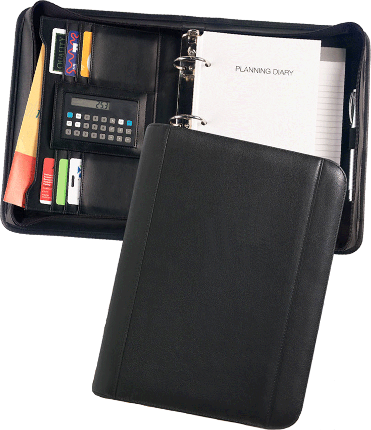 Stitched padded covers with exterior pocket. 1 1/2" capacity three-ring binder - for standard 5 1/2 x 8 1/2 Preference Brand or McCarthy Planner Inserts. Gusseted interior pocket. 6 business/credit card pockets. ID window accommodates optional calculator. Elastic pen loops and micro-perfed ruled pad. Includes Monthly/Weekly Refill Calendar Insert.