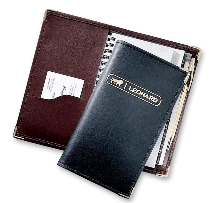 9" x 6" foam-padded covers. Black moiré vinyl lining. Rounded metal corners. 8" x 5" wirebound monthly/weekly planner. 8" x 5" wirebound tabbed phone/address book insert.