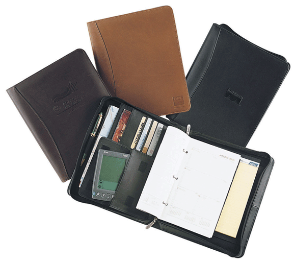 6 3/4" x 3 3/4" 6-ring binder with bonded leather cover. Has multiple card slots, interior pocket and zippered closure. 324 pages. Day-to-a-page format. To Do & address pages. A-Z & monthly tabbed indices. Page locator.